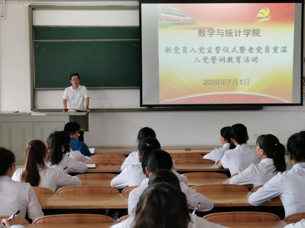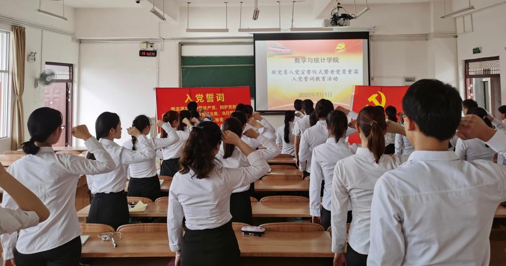 在党的九十九岁华诞到来之际,7月1日下午,数统学院党总支部在弘毅楼2-407教室开展庆祝建党九十九周年,新党员入党宣誓暨老党员重温入党誓词大会。学院党总支部副书记,院长罗日才、党总支部副书记张明进、学生党支部全体成员参加了大会,会议由张明进主持。