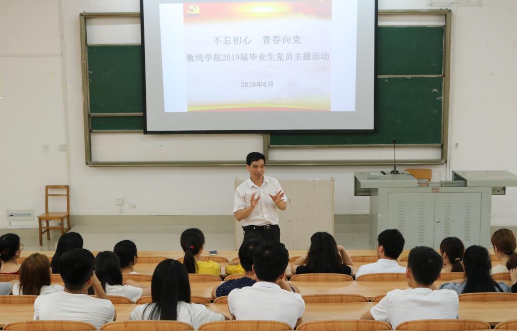 6月3日下午,数统学院在弘毅楼1-102教室开展“不忘初心 青春向党”主题党日活动。学院党总支部书记黄星寿、团委书记罗曼、全体2019届毕业生党员参加主题党日活动。