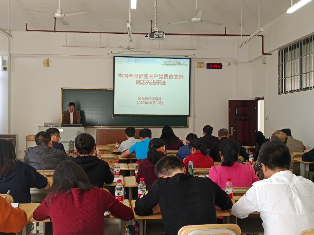 10月30日下午,数统学院全体教职工于西区格致楼710教室学习了黄文秀同志的先进事迹。学习会上,黄星寿说:“风华正茂的年纪,黄文秀同志选择了扎根基层,反哺家乡;她30岁的生命永远定格在扶贫路上。今年7.1习近平总书记对黄文秀同志先进事迹作出重要指示,习近平总书记希望广大党员干部和青年同志要以黄文秀同志为榜样,不忘初心、牢记使命,勇于担当、甘于奉献,在新时代的长征路上做出新的更大贡献。今天,我们在这里深切缅怀黄文秀同志,既是要学习并弘扬她伟大无私的奉献精神,致敬她赤诚而火热的初心;又是要以她为榜样,牢固树立使命意识,努力做到立师德,育英才”。与会教师表示,要积极学习黄文秀同志不忘初心、牢记使命的坚定信念,学习黄文秀同志勇于担当、攻坚克难的政治品格,学习黄文秀同志甘于奉献、饮水思源的赤子之心,学习黄文秀同志心系群众、公而忘私的为民情怀,切实把学习榜样的精神力量转化为推进工作的强大动力,为我校高质量完成审核评估工作和今后学院的发展贡献力量。