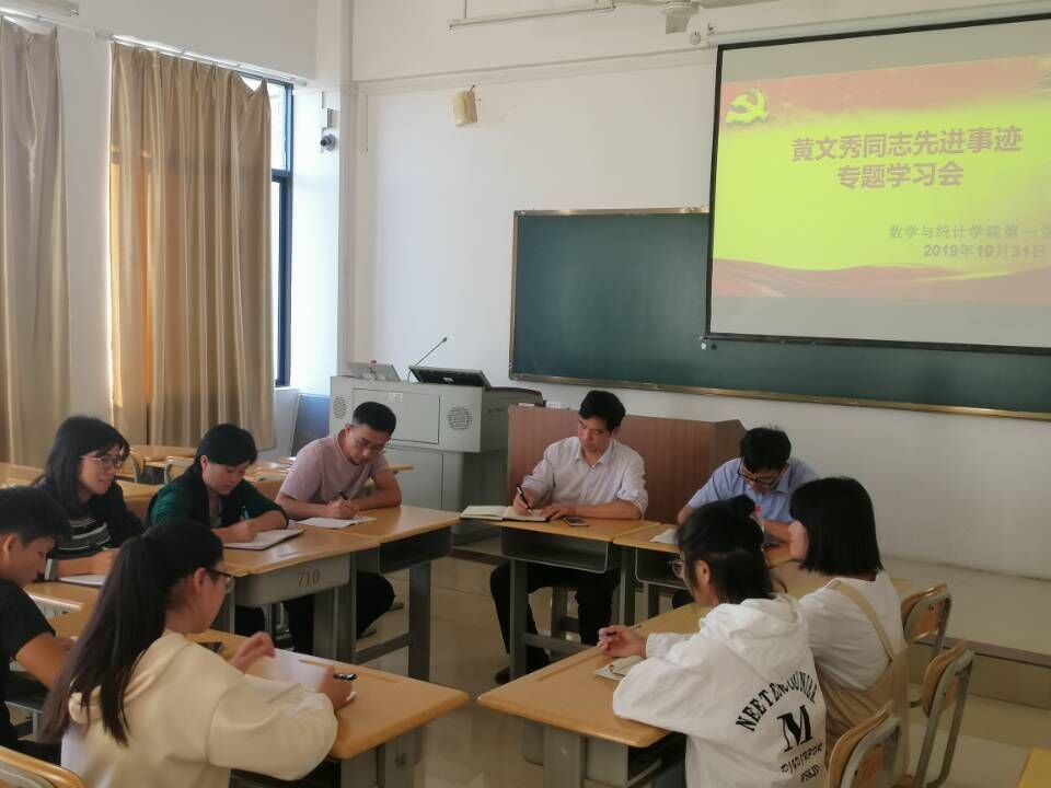 10月29日上午,数统学院理论中心组成员于西区格致楼802办公室专题学习黄文秀同志先进事迹。学习会上,理论中心组全体成员学习了黄文秀同志先进事迹。黄文秀用生命诠释了共产党人不忘初心、牢记使命的理想信念与责任担当。她克服困难、扎根基层,坚决打赢脱贫攻坚战,用美好青春诠释了共产党人的初心使命,谱写新时代的青春之歌。