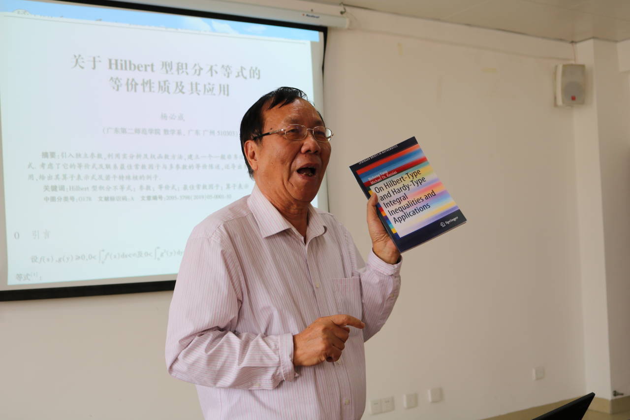 报告会上,杨必成教授以“关于Hilbert型积分不等式的等价性质及其应用”为主题并结合起承转合的哲学思想进行扩展说明。讲座最后,他还同在座教师进行了气氛热烈的学术座谈。最后罗日才表示,杨必成教授执着科研,专注学术的精神让人敬佩,希望全院教师能在今后更加自觉的钻研学术,以科研反哺教学,为学院教学科研能力的提升贡献力量。