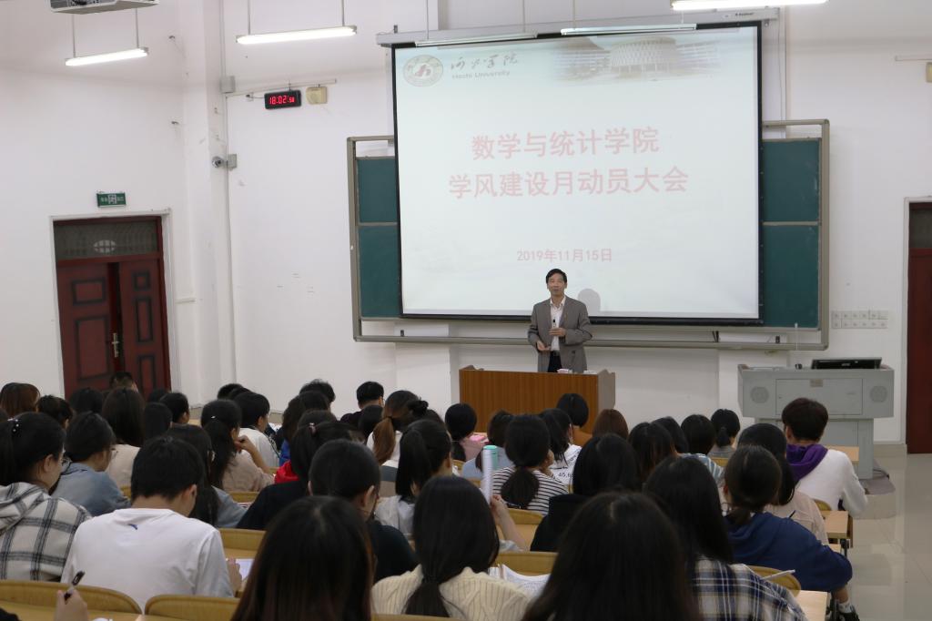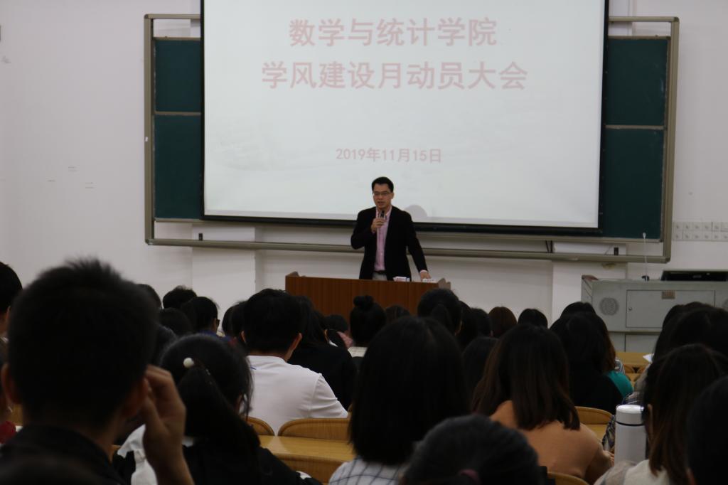 为深入开展好学风建设月系列活动,促进学生明确学习目的,端正学习态度,激发学习动力,积极营造优良学风。11月15日,数学与统计学院在格致楼负102教室召开学风建设动员大会。数统学院党总支部书记黄星寿、党总支部副书记张明进、学院团委书记罗曼、学院辅导员,各班班主任以及各班级学生代表参加动员大会。