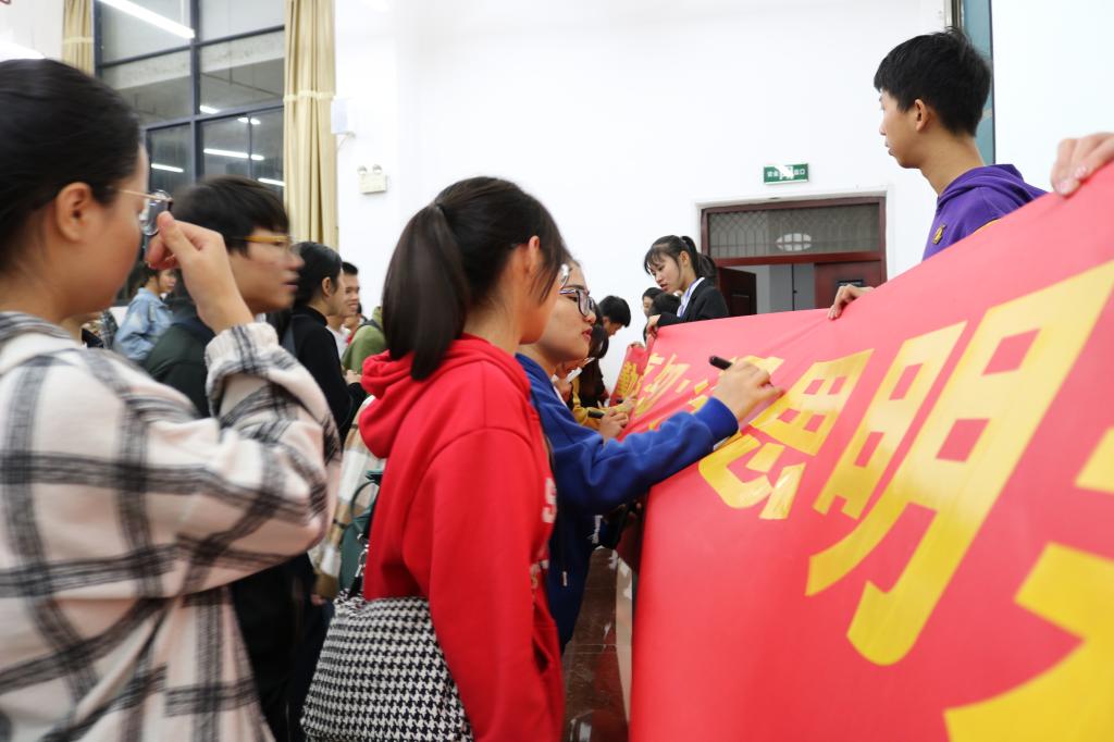 会上,黄星寿发表动员讲话,他指出学风建设是校风建设的重中之重,是本科教学工作水平评估的一项重要内容。学院全体同学们务必高度重视,统一思想、提高认识,按照学校学风建设相关要求及学院学风建设方案内容抓好落实、确保成效。他表示希望大家回归本分,勤学苦读,通过本次活动展现我院良好学风。随后,张明进传达学校学风建设月相关文件精神,罗曼从学习、纪律、班级管理和宿舍管理等方面详细介绍了我院学风建设月活动方案。最后我院学生代表蓝梦婷宣读了学风建设月倡议书,各班级同学代表还在宣传横幅上进行了签字活动。