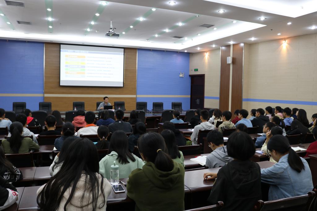 讲座上,张良均董事长围绕大数据的人才需求现状、相关岗位的区域分布和岗位的技能要求等方面进行了详细讲解,阐述了目前大数据岗位的人才区域分布、职业类型、学历要求、薪酬情况等,提出大数据应用型人才的培养应该从“学以致用”向“用以致学”转变,建议采用鱼骨教学法,以项目为引导,梳理所需学习的课程体系,以满足企业对熟练专业技术人才的需求。他指出,希望同学们在大学期间勤奋好学,扩大知识面,提升专业技能;也希望同学们能关注产业发展,把自己的所学的专业和社会需求结合起来,努力提升实践技能,以更加从容的姿态迎接社会的挑战。张良均董事长用通俗易懂的语言阐述金融与大数据领域深奥的理论知识及热点问题,使更在场的师生深入了解了大数据领域相关知识,增长了见识。