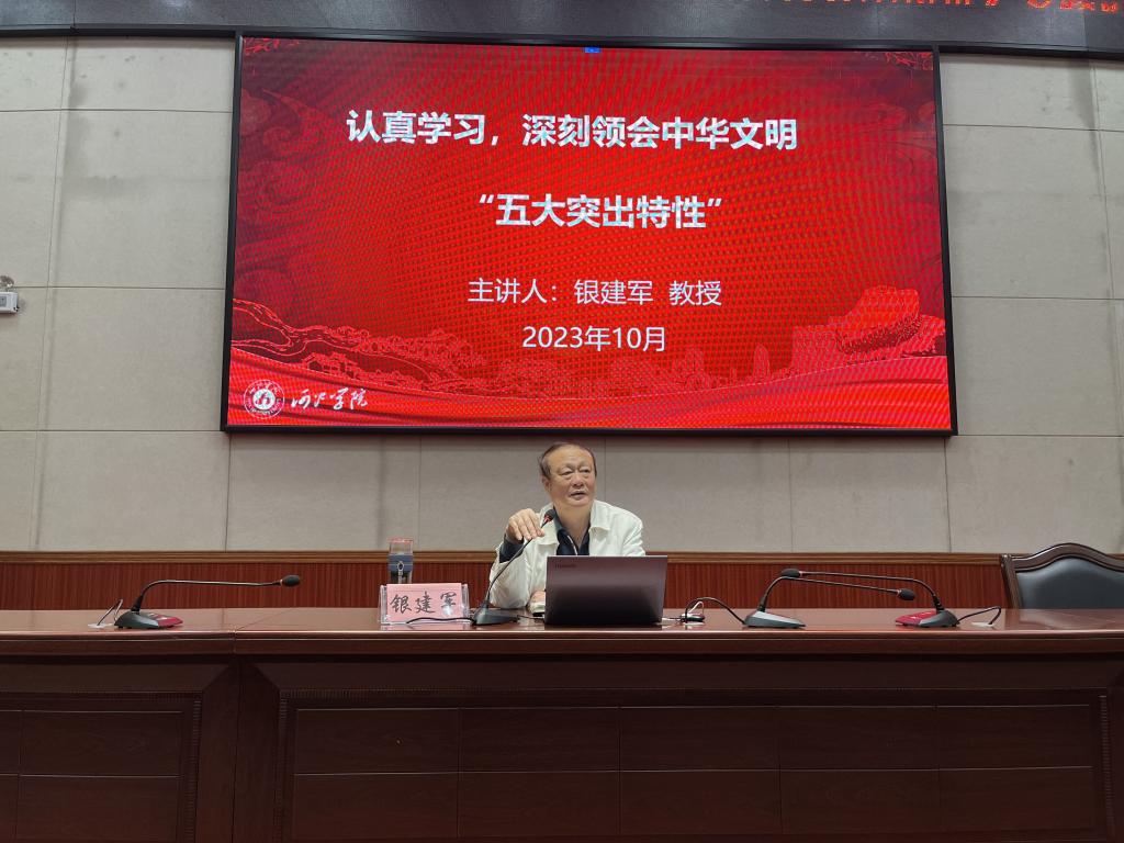 10月11日下午,betway必威西汉姆联官网在弘毅楼1-205报告厅举行《认真学习深刻领会中华文明五大突出特征》专题讲座。讲座邀请河池学院原党委书记银建军教授主讲,我院党委副书记石宁主持,betway必威西汉姆联官网全体学生党员、发展对象和入党积极分子参加。