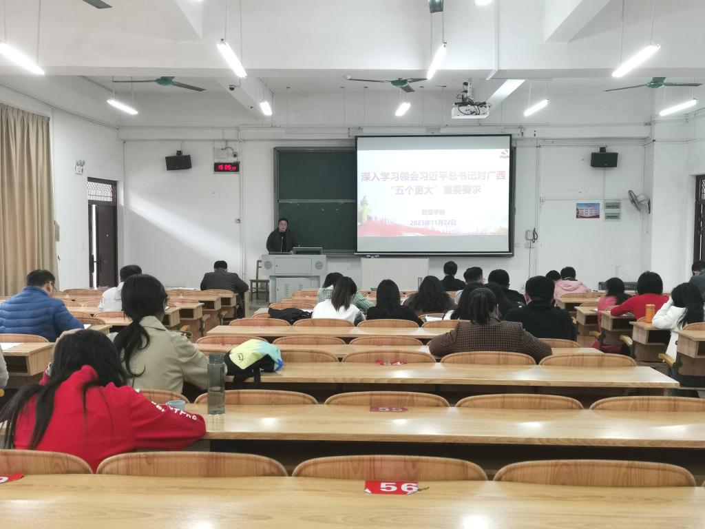 11月22日,betway必威西汉姆联官网在弘毅楼2-104教室召开学习贯彻习近平总书记对广西“五个更大”重要要求学习会,学习会由学院党委书记罗美金主持,学院全体教职工参加学习会。