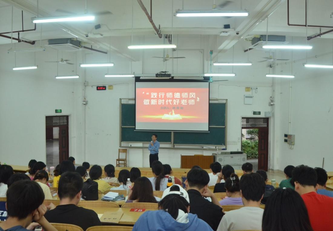 讲座由三部分组成。首先,黄老师阐述了“一践行,三学会”中“践行师德”的概念与要求,他强调,师德师风是教育工作者的职业道德和行为作风的综合体现,是评价教师队伍素质教育的第一标准。接着黄老师带领同学们深度解读师德师风十项准则。黄老师认为,在教师的职业生涯中,教师需要加强自身的政治思想学习,并把学习和自身的工作结合起来,提高自身职业素养。最后黄老师根据从教几十年的丰富经验,结合具体案例向同学们传授如何完善自身的专业综合素质,真正地成为新时代好老师。