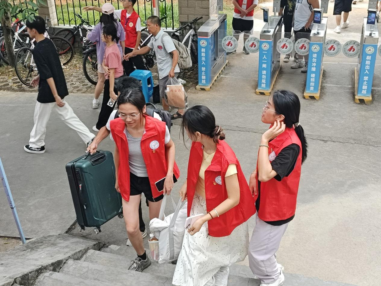 党员们身披红色志愿者服装,佩戴党员党徽,以热情、饱满的精神面貌投入到迎新服务当中。随着新生与家长陆续步入校园,党员们根据工作安排,各司其职,迅速就位,为新生与家长提供解答疑问、协助办理报到手续等服务。这些志愿者在新生报到期间,亮出党员身份,将“党员红”化身为“志愿红”,以饱满的热情投入到咨询引导、秩序维护、行李搬运、协调调度等工作中。