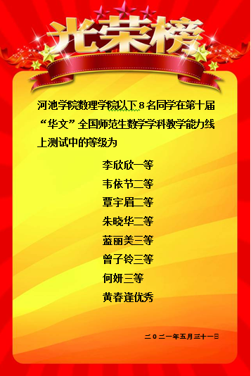 betway必威西汉姆联官网副院长肖春梅教授与卫银虎老师指导李欣欣等8名学生参加了2021年第十届“华文”全国师范生数学学科教学能力线上测试与展示交流活动。赛前经过指导老师全方位训练与指导,我院8名参赛选手经过线下微课设计,线上教学以及答辩等环节的激烈角逐,最终取得一等奖1项,二等奖3项,三等奖3项,优秀奖1项的优异成绩。